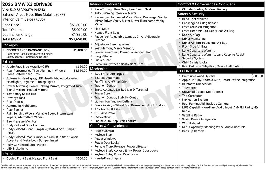 Finished in the eye-catching Arctic Race Blue Metallic, this X3 commands attention wherever it goes. Under the hood, the potent I4 engine and 8-speed automatic transmission deliver an exhilarating driving experience, with an impressive 27 city/33 highway MPG rating.