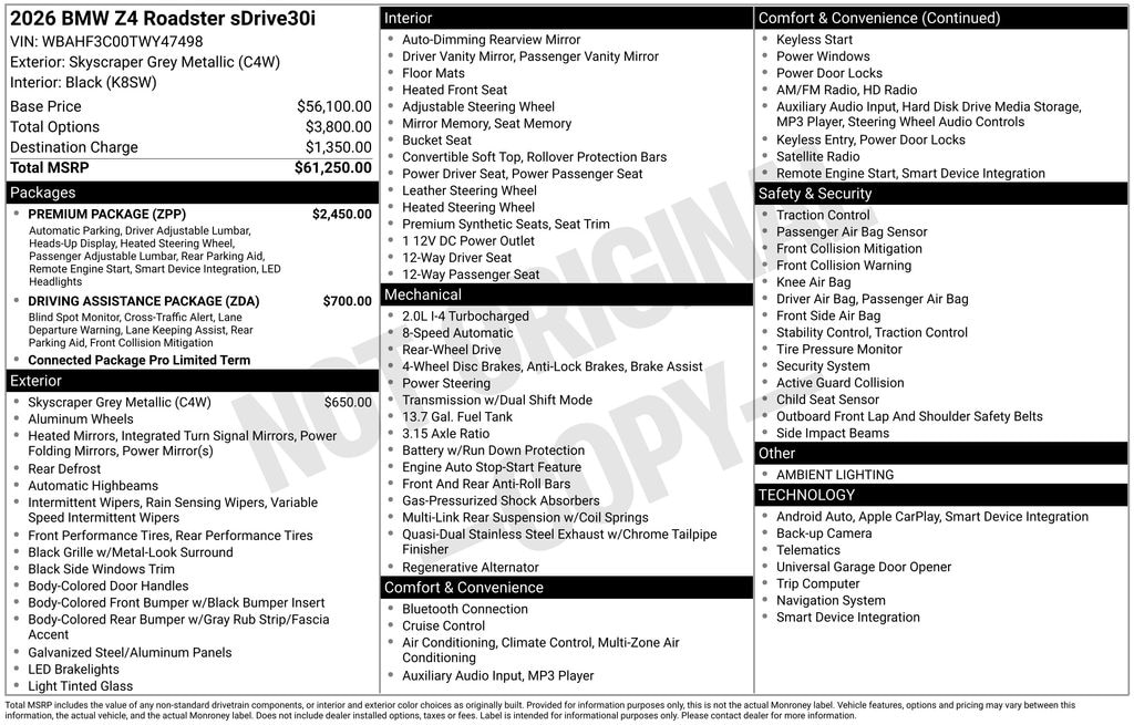 This exceptional 2026 BMW Z4 sDrive30i is the perfect blend of power, style, and sophistication. With its impressive performance, unparalleled features, and timeless design, it's the sports car you've been waiting for. Visit our showroom today to experience the thrill of the open road in this remarkable vehicle.
